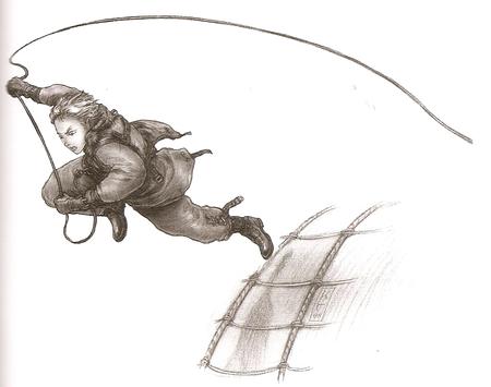 Her airman’s uniform was miles better than any girls’ clothes. The boots clomped gloriously as she stormed to signals practice or firefighting drills, and the jacket had a dozen pockets, including special compartments for her command whistle and rigging knife. And Deryn didn’t mind the constant practice in useful skills like knife throwing, swearing, and not showing pain when punched.[2]
